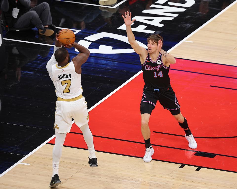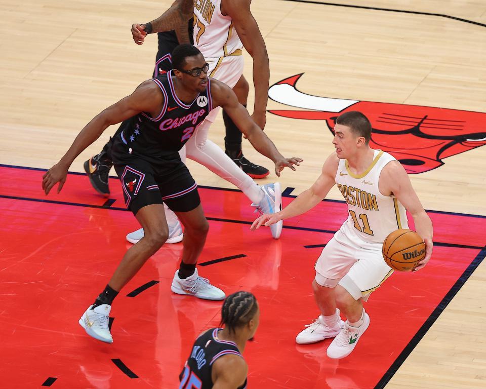 凯尔特人过去两场连赢步行者与篮网收获2连胜,公牛过去3场连赢篮网、快船与森林狼收获3连胜,本赛季首次交锋凯尔特人主场115-101战胜公牛。本场凯尔特人缺少塔图姆与米诺特,公牛缺少科林斯、琼斯。首节前3分半钟双方缠斗至凯尔特人13-12领先,公牛连得4分反超,布朗上篮追分。公牛接连得分逐步扩大6分领先优势,凯尔特人内外开花咬住比分,首节结束凯尔特人28-30落后。首节凯尔特人三分11中4,布朗7中4得到11分;公牛三分14中6,吉迪与武切维奇合计3中0得到0分。
